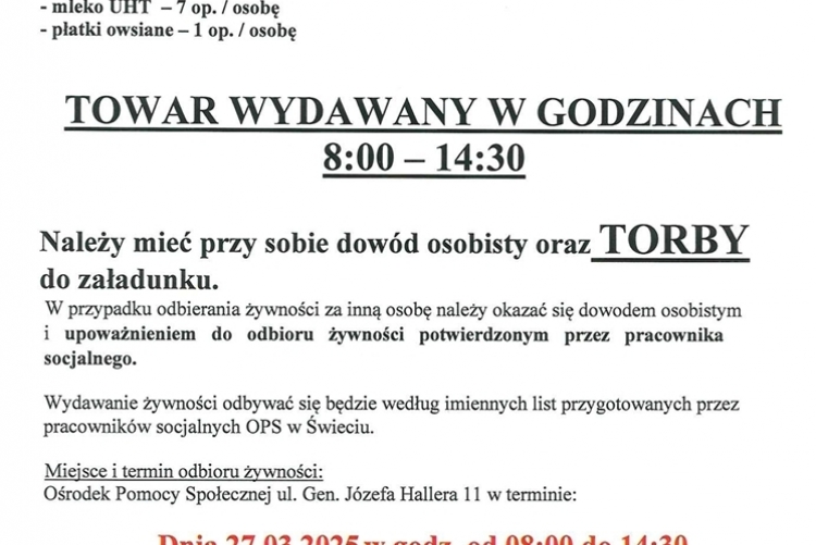 mar 25 2025 Dystrybucja żywności w dniach: od 27.03.2025 r. do 01.04.2025 r. Pliki: Wydawka żywności marzec 2025 rok.pdf
