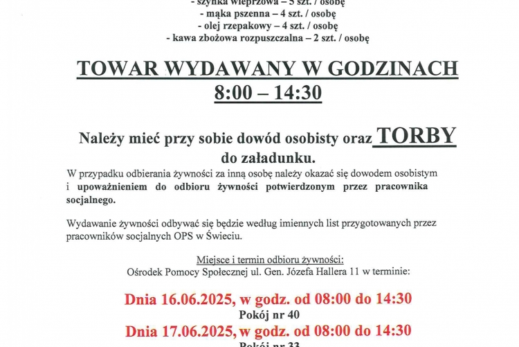 Dystrybucja żywności w dniach: