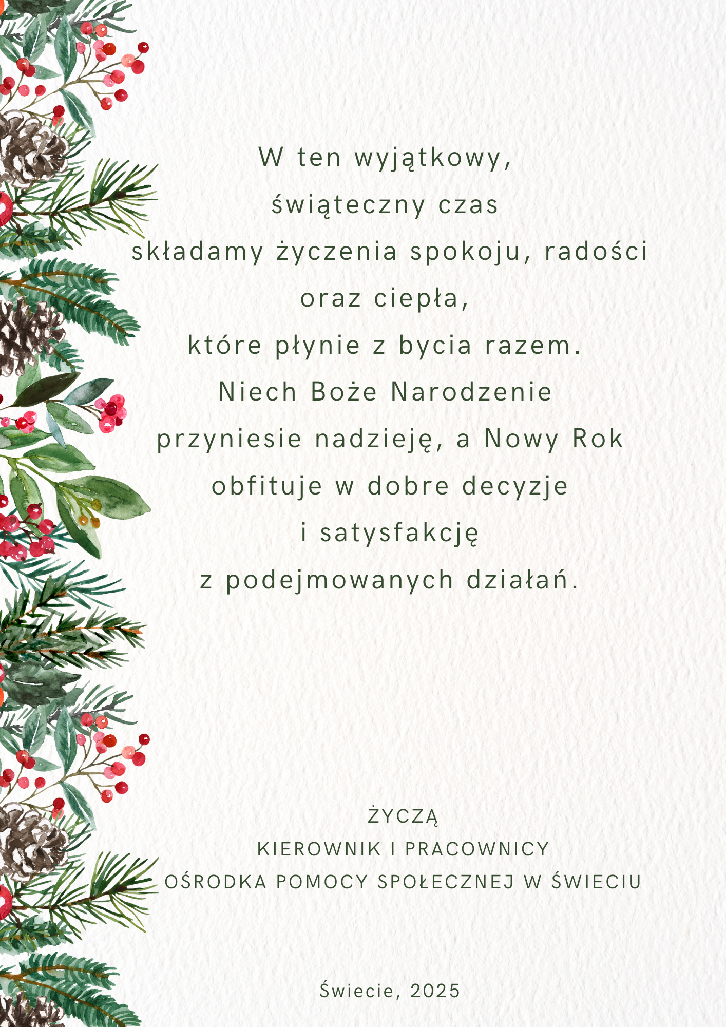 W dniu 12.12.2025r. Ośrodek Pomocy Społecznej w Świeciu zorganizował dla seniorów spotkanie wigilijne połączone z zakończeniem projektu socjalnego