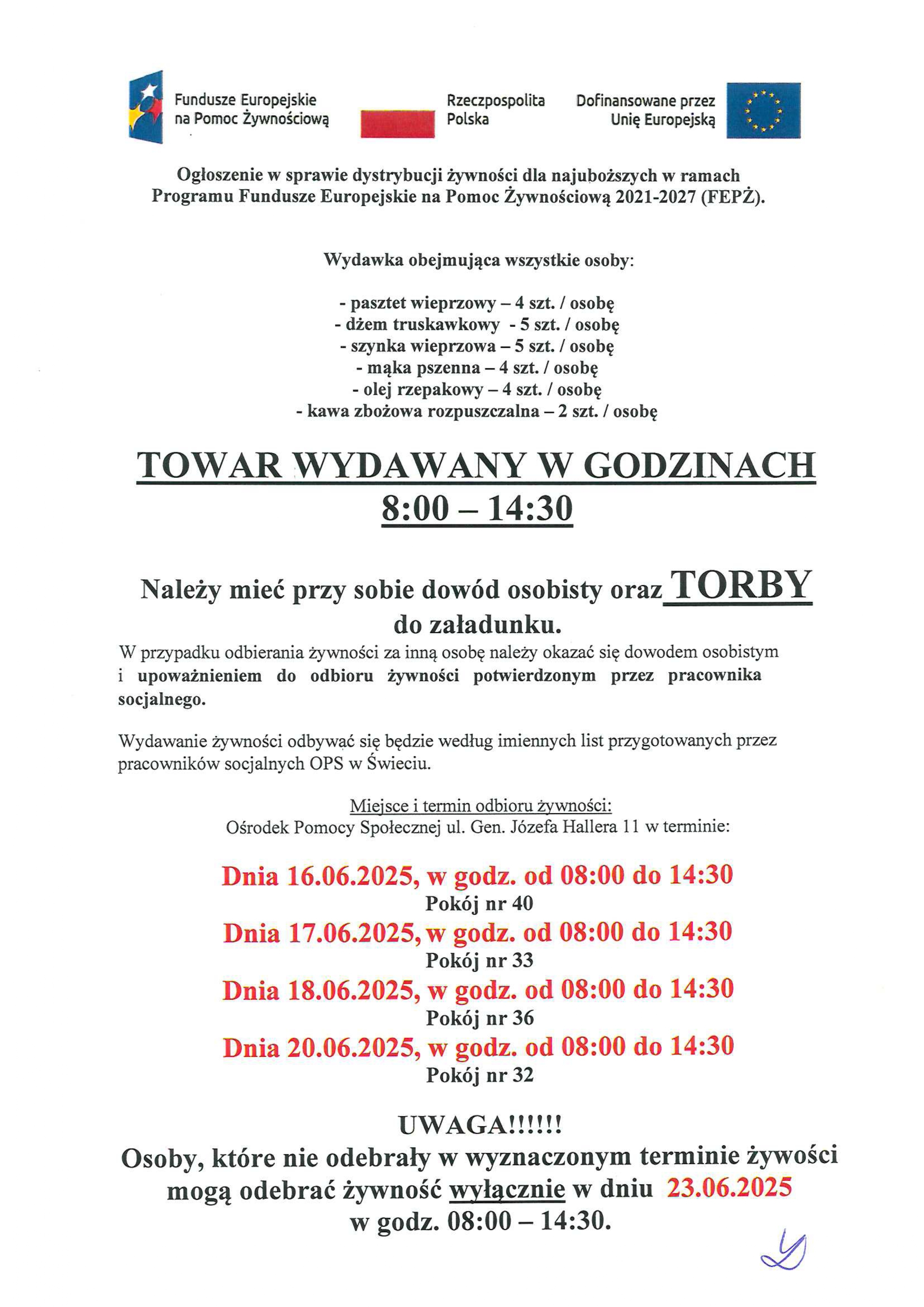Dystrybucja żywności w dniach: