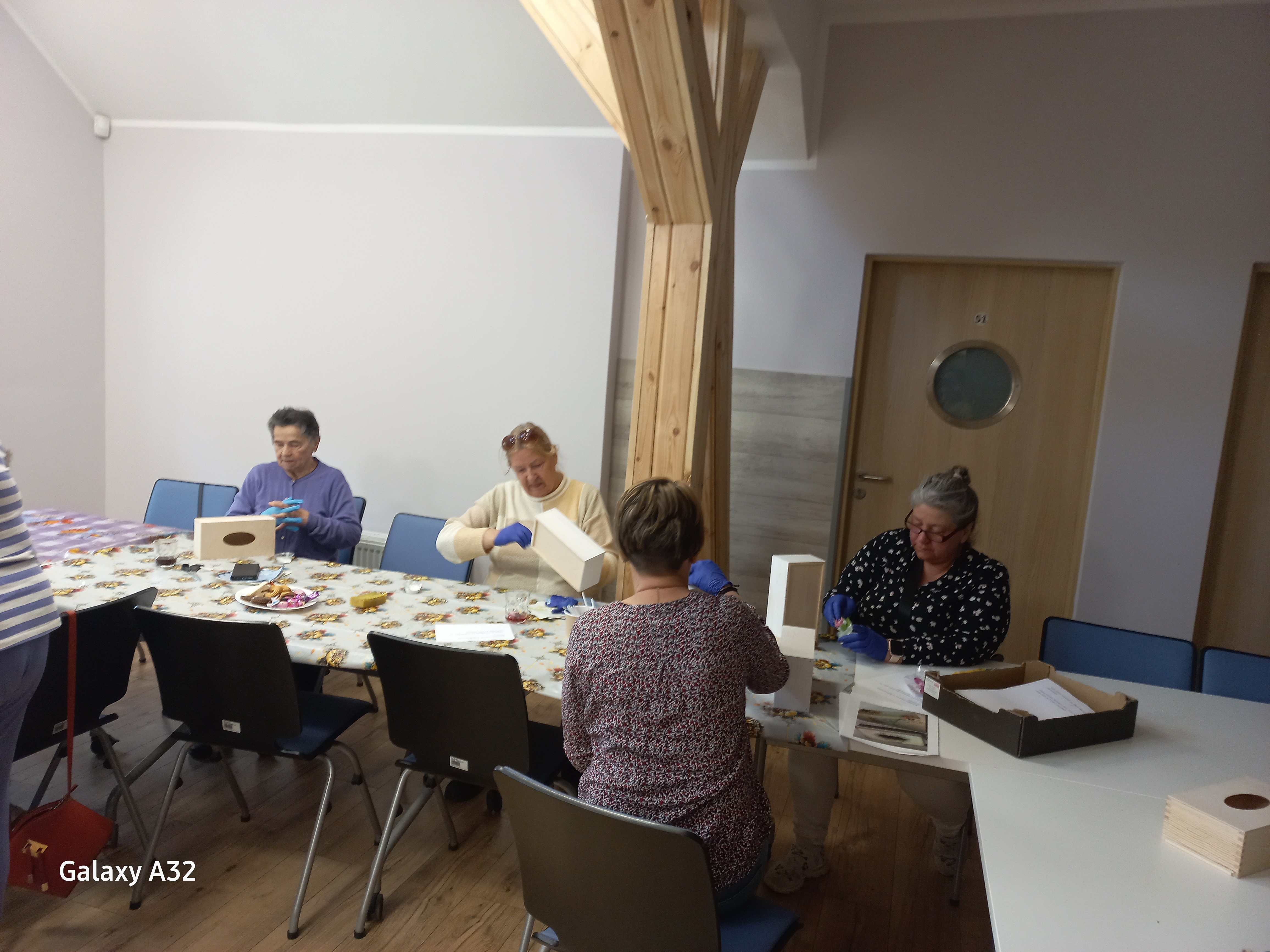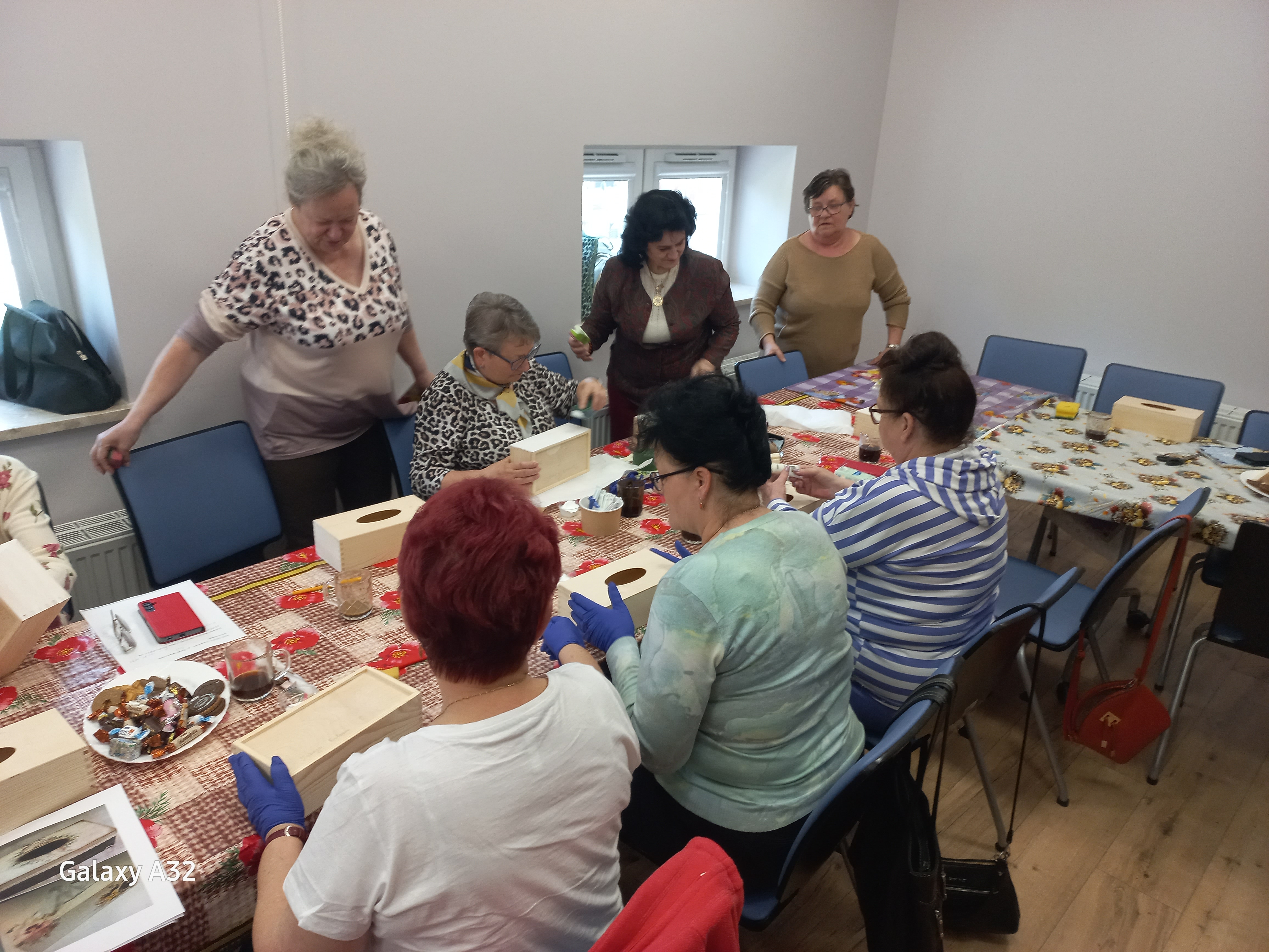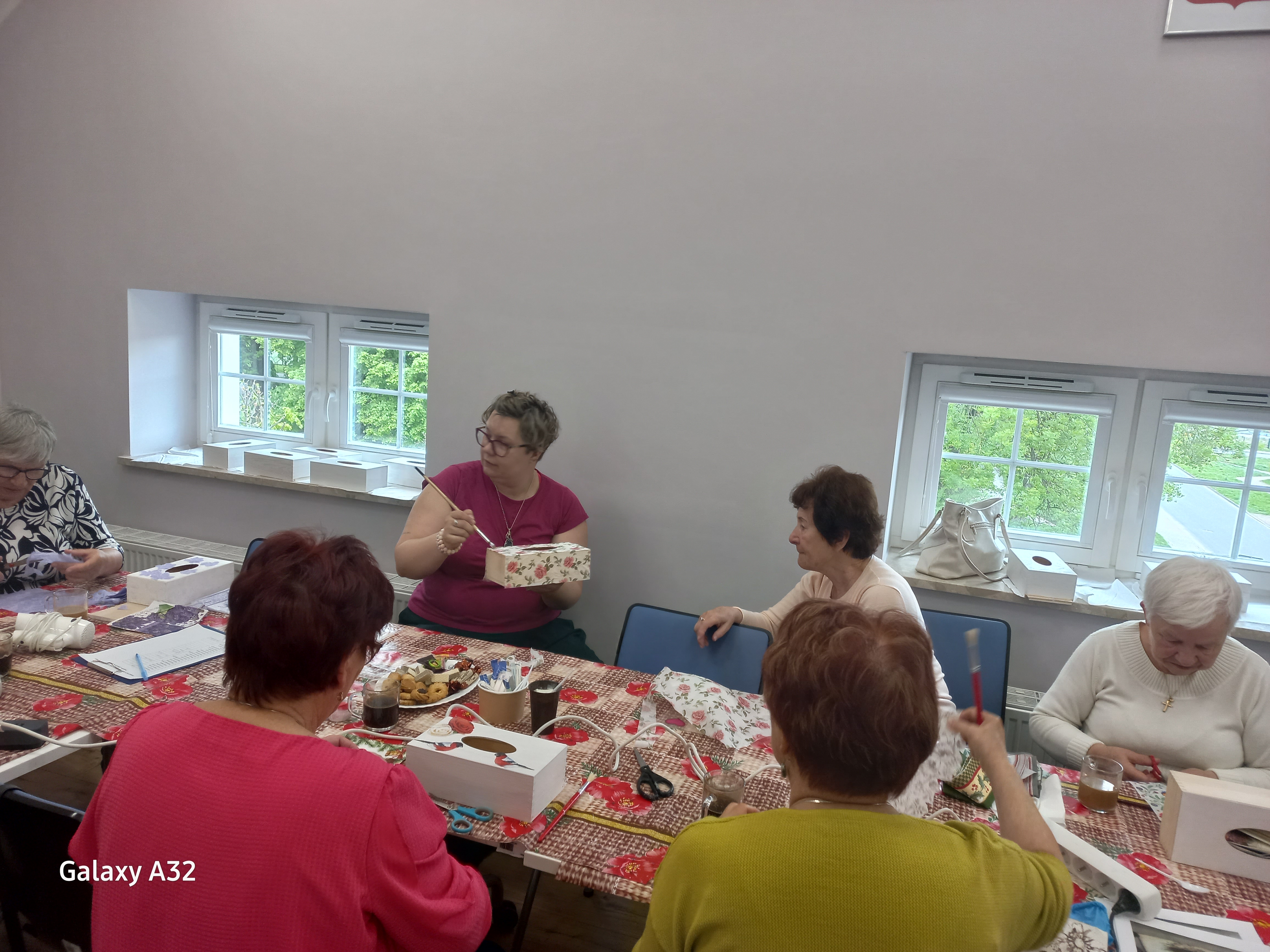 z wykorzystaniem papierów ryżowych oraz chusteczek ozdobnych. Do wyboru były różne wzory i różna kolorystyka, czego efektem były wyjątkowe pudełka według własnego projektu. Uczestnicy pracowali na farbach akrylowych, papierach oraz preparatach do techniki decoupage, całość wykończona została lakierem. Każdy uczestnik wyszedł z zajęć z gotowym, własnoręcznie ozdobionym pudełkiem na chusteczki.